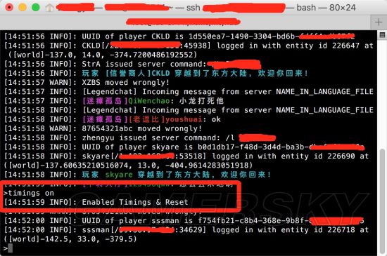 要使用这个功能,首先你需要在服务器内或者直接在后台内输入指令 —— timings on 开启统计,具体如图所示: