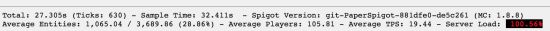 Total 是指从统计开始一共服务端运行的时间(由 Ticks 推算),Sample Time 是指统计总时长。后面紧跟着的是服务端的版本信息,例如我的是 PaperSpigot1.8.8,Average Entitys 是平均实体的数量,表示形式是 活跃实体数量 / 总实体数量。一般而言只有活跃实体才会消耗 CPU 时间。Average Players 是统计时间内平均这个服务端在线的人数(注意,是单个服务端的在线人数),例如我的是 105.81 人。Average TPS 是统计时段内平均的 TPS,例如我的是 19.44。Server Load 是指服务端负载水平。超过 100% 则意味着 TPS 会开始低于 20 的水平,一般超过 150% 就会有明显卡顿了。